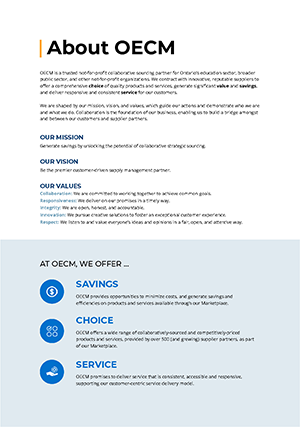 OECM is a trusted not-for-profit collaborative sourcing partner for Ontario’s education sector, broader public sector, and other not-for-profit organizations. Read more