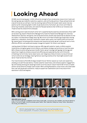 OECM Annual Report 2024 Table of Contents - About OECM, Chair's Message, CEO's Message, Our People, Commitment to ESGI, Strategic Growth Plan, 2024 Business Highlights, Looking Ahead