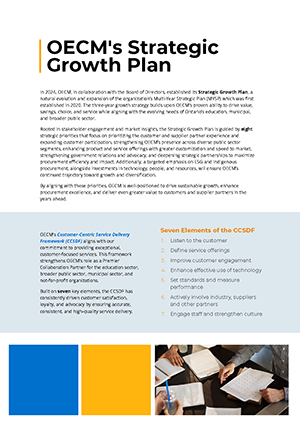 Leveraging our proven ability to drive value, savings, choice and services, OECM’s Strategic Growth Plan prioritizes our customers, suppliers, employees, and partners across the BPS to identify and action opportunities for collaboration, growth, and diversification. Read more